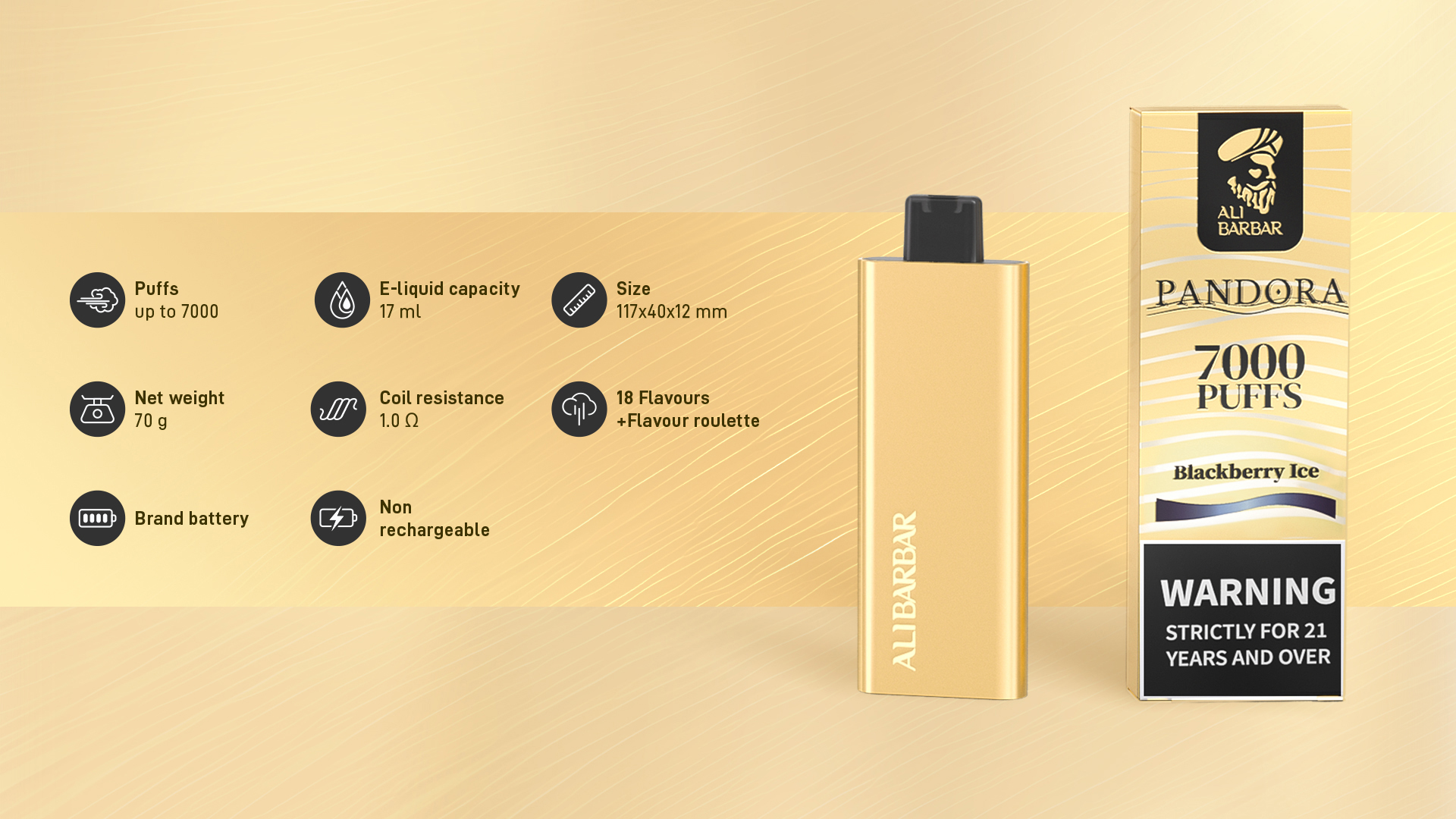 Csomagolás tartalma: 1 db Alibarbar Pandora 7000 eldobható e-cigaretta, zárt csomagolásban és dobozban